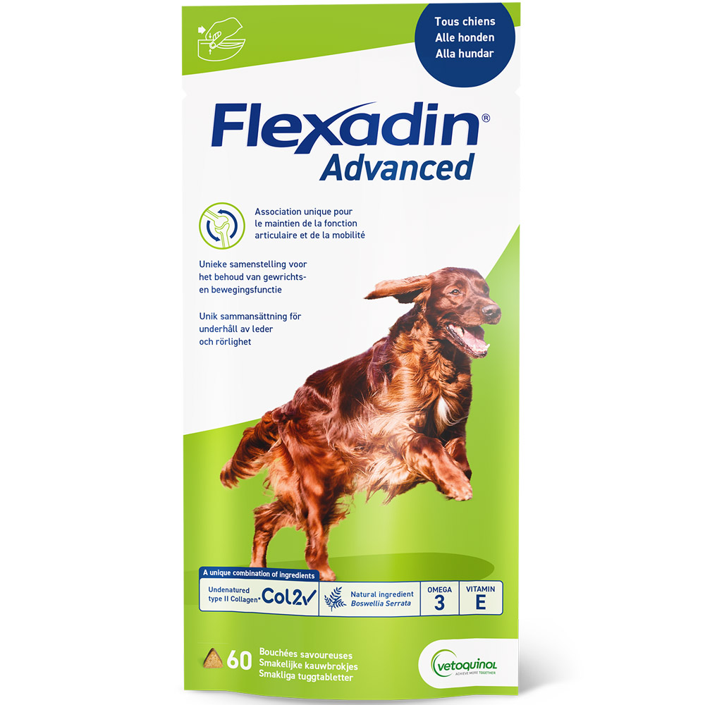 De formule van Flexadin Advanced is verbeterd. Nu bevat de formule ook Boswellia Serrata, dat bijdraagt aan een complete ondersteuning van de gewrichten. Flexadin Advanced blijft beschikbaar per 30 of 60 zachte kauwbrokjes.